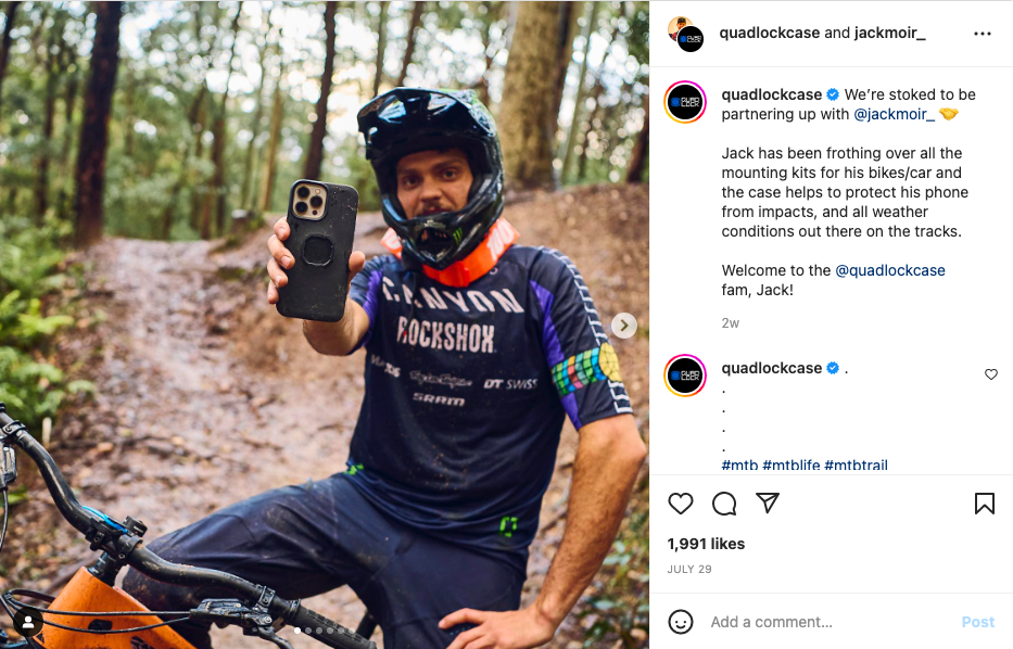 Quadlock is a phone mount company targeting adventurers and sports enthusiasts who are looking for a reliable and secure way to mount their phone. Their social media channels are dominated by user-generated content. Think images and videos of their ideal customers, in action using their product (and living the dream).